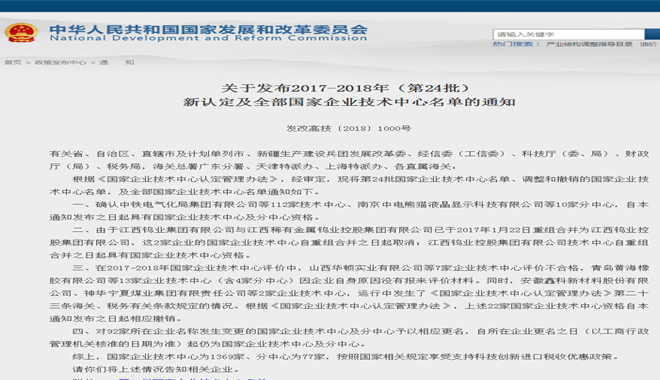 7月13日,在国家发展改革委、科技部、财政部、海关总署、税务总局联合公布的2017-2018年(第24批)国家企业技术中心名单上,华体会体育·(中国)官方网站赫然在列,公司研究院获批成为“国家企业技术中心”。这标志着华体会体育集团科研系统再上新台阶,正式步入“国家级科研平台”之列!